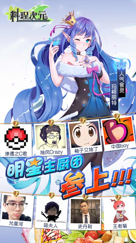 《料理次元》为让玩家体验纯正的二次元手游,邀请十余位日本一线声优助阵!钉宫理惠、花泽香菜、内田真礼、有赤尾光、杉浦诗织等声优界大咖等你到游戏中亲身探寻!而画师方面不仅有薯子(玉子烧画师)、影法师(北京烤鸭画师)、Mvv(鲱鱼罐头画师),还有Bison仓鼠、真名、TID、紫菜NORI、kaze、哈鲁卡、RFF、阿芸芸芸、蘑格里、15k、月见等百余名画师倾情助阵,为您献上一场豪华的视听盛宴!