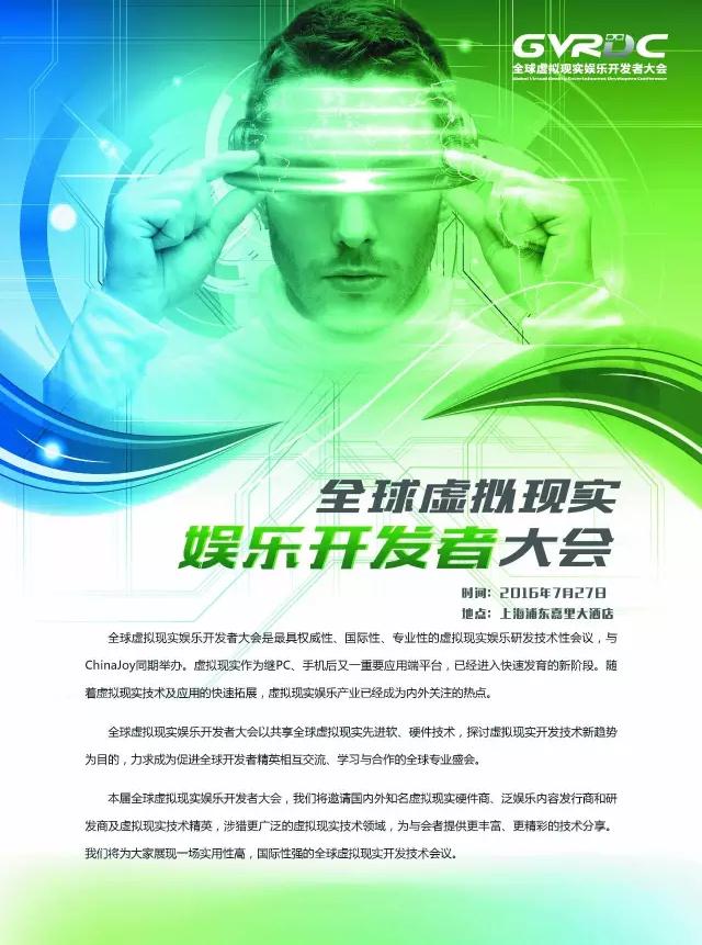 2016全球虚拟现实娱乐开发者大会(GVRDC)将于7月27日在上海浦东嘉里大酒店隆重举办。全球虚拟现实娱乐开发者大会是中国国际数码互动娱乐展览会同期举办的产业高端会议。2016GVRDC主题为“虚实相生,技术为先”。