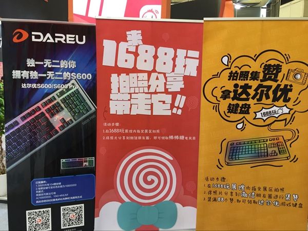 本次2016ChinaJoy,1688玩准备的周边品类无比丰富,从雨伞、帽子、鼠标垫和环保袋等小物品、主打产品的棒棒糖电扇和达尔优键盘更是炙手可热难求一件。拍摄1688玩展台发至朋友圈集88赞即可获得一只达尔优键盘的消息在半日内就传遍了整个场馆,前来参与活动的观众络绎不绝,尽管进行了有计划的节制发放,但是观众热情难当。第三日上午开馆后十分钟,所有键盘都已赠送一空。