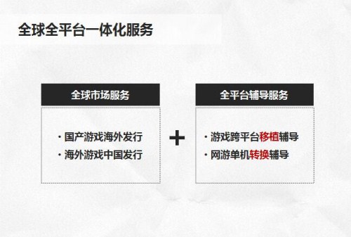 全球全平台一体化服务,主要为中国游戏开发者出海和海外游戏开发者进入中国市场提供相关服务,同时针对游戏跨平台移植和网游单机的品类转换进行辅导。