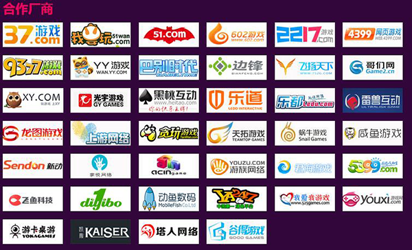 37游戏、51wan、51游戏社区、602游戏、2217游戏、4399网页游戏、9377游戏、YY游戏、巴别时代、边锋网络、飞扬天下、哥们网、XY游戏、光宇游戏、黑桃互动、乐道、乐都网、雷兽互动、龙图游戏、上游网络、贪玩游戏、天拓游戏、蜗牛游戏、咸鱼游戏、新动互动、掌悦网络、中顺和盈、游族网络、君海游戏、5399游戏、飞鱼科技、第一波、动鱼数码、Y247、我爱我游戏、youxi网、游卡桌游、凯撒网络、塔人网络、谷得游戏