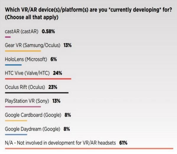 近期,GDC(游戏开发者大会)公布了2017全球游戏产业报告。报告中显示,39%的与会开发者正在开发VR/AR游戏,其中24%的开发者选择了HTC Vive作为开发平台,使其领先于其他竞争者,成为了“最受欢迎”的平台。自2015年3月问世至今已经过去了两年,HTC Vive始终走在VR设备大队的最前列,无论是在技术层面还是内容层面,HTC Vive始终是树立在众多开发者面前的榜样与标杆。