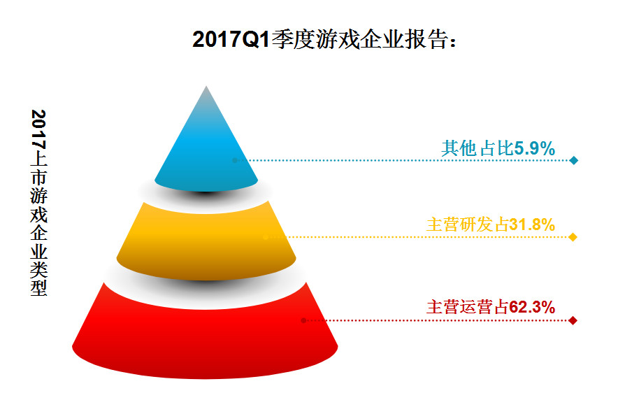 截至2017年Q1季度末,《中国游企版图》关注过5000家游戏企业,按选择标准收录1926家企业, 中国上市游戏企业数量(含被并购)共计170家,覆盖全国90%以上市场份额。其中主营运营占62.3%,主营研发占31.8%,其他占比5.9%。