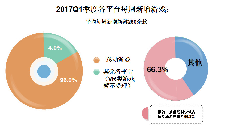 2017年Q1季度,《中国游企版图》结合“在线版号查询”分析,平均每周新增PC、移动、主机平台新游260余款,移动游戏约占96.0%,其余各平台(VR类游戏暂不受理)占比4.0%。此外,棋牌、捕鱼题材游戏占每周新游总量的66.3%。