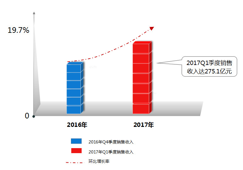这里需要重点指出的是,随着2017年Q1的结束,《中国游企版图》对比去年数据进行分析,惊喜的发现,国内移动市场在Q1呈现了一次比较不错的增量,环比增长了19.7%,销售收入一度达到275亿元。其中主要的增量来源于国内移动电竞的兴起和发展。移动游戏市场在经历2016年一年的稳定增长后,在2017年里再次激发出潜能,呈现近两年来最高的一次增量,这主要由《王者荣耀》、《穿越火线:枪战王者》为代表的移动电子竞技游戏所带来。移动电竞的迅猛兴起主要受益于碎片化时间以及用户对竞技类游戏的需求影响,获取付费用户的重心逐渐从少量鲸鱼用户转变为对虾米用户的累积上。