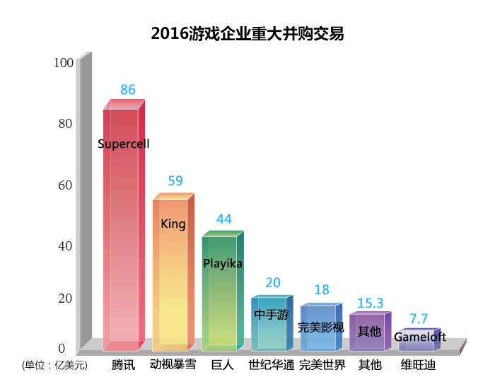 2016年,包括腾讯、百度、阿里、盛大、巨人、完美世界等20余家国内游戏企业,及以动视暴雪、Gameloft为主导的国外游戏企业。在兼并与收购交易领域所支出的金额已经达到了250亿美元(约合人民币1700亿),大型并购交易包括有腾讯以86亿美元的价格收购Supercell公司84.3%的股份(Supercell的总估值为102亿美元)、动视暴雪以59亿美元的价格收购King公司、巨人网络以44亿美元收购以色列棋牌游戏公司Playtika。