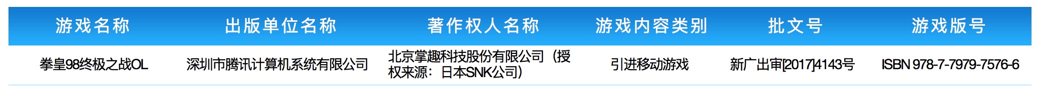 综上所述,结合中国游戏产业网“在线版号查询”系统中已审核游戏的研发、出版、发行企业信息。以《拳皇98终极之战OL》为例,游戏著作权人为:北京掌趣科技股份有限公司(授权来源:日本SNK公司),出版单位为:深圳市腾讯计算机系统有限公司。不难看出,因腾讯游戏在2016年对游戏企业的战略投资,为腾讯游戏2017持续代理多家游戏企业大作打下了坚实的基础。