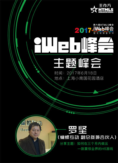 2017年6月18日,“2017•iWeb峰会•上海站”在上海市杨浦区小南国花园酒店顺利召开。行业各领域权威人士现场坐而论道,共同探讨HTML5最新技术的与行业趋势。蝴蝶互动作为H5发行的领军企业参加,在会上,副总裁兼合伙人罗坚分享了精品游戏《御天传奇H5》的研发经验。