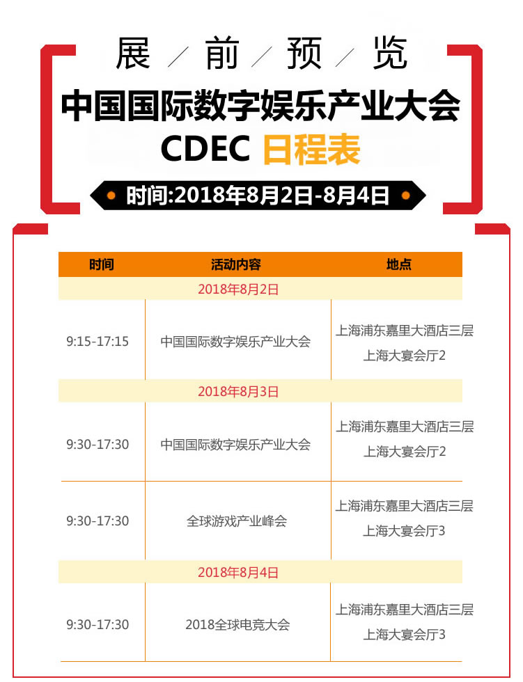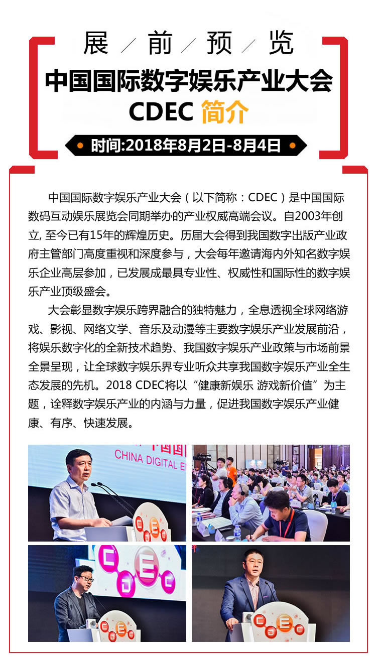 鉴于2018年第十六届ChinaJoy展会开幕在即,ChinaJoy组委会特在此放出ChinaJoy展前预览中国国际数字娱乐产业大会(CDEC)篇,帮助大家更详细地了解相关信息与资讯——值此盛事,相信本届ChinaJoy将为大家呈现更多精彩!