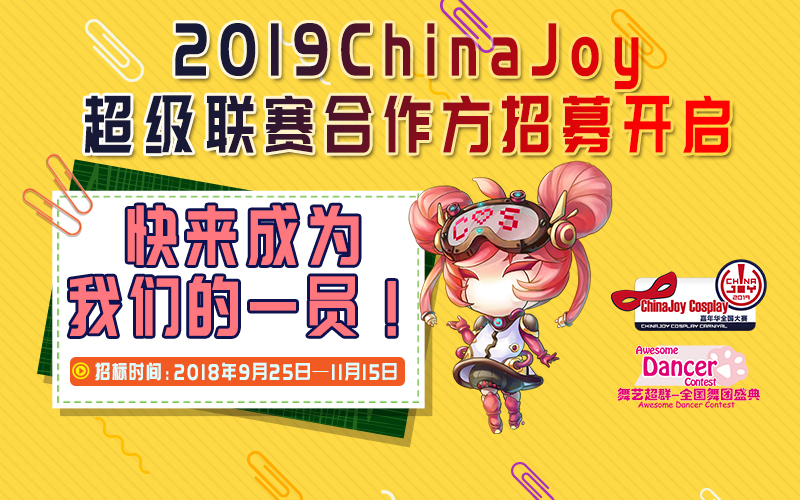 在即将到来的新一年里,为了能更好地推动国内二次元相关文化的普及与发展,为了能让更多地区的动漫爱好者参与到ChinaJoy超级联赛中来,ChinaJoy组委会正式面向具有诚信的属性,还不乏组织二次元大型活动的经验和资源,并且愿意为推广二次元文化贡献一份力量的企业发出邀请!
