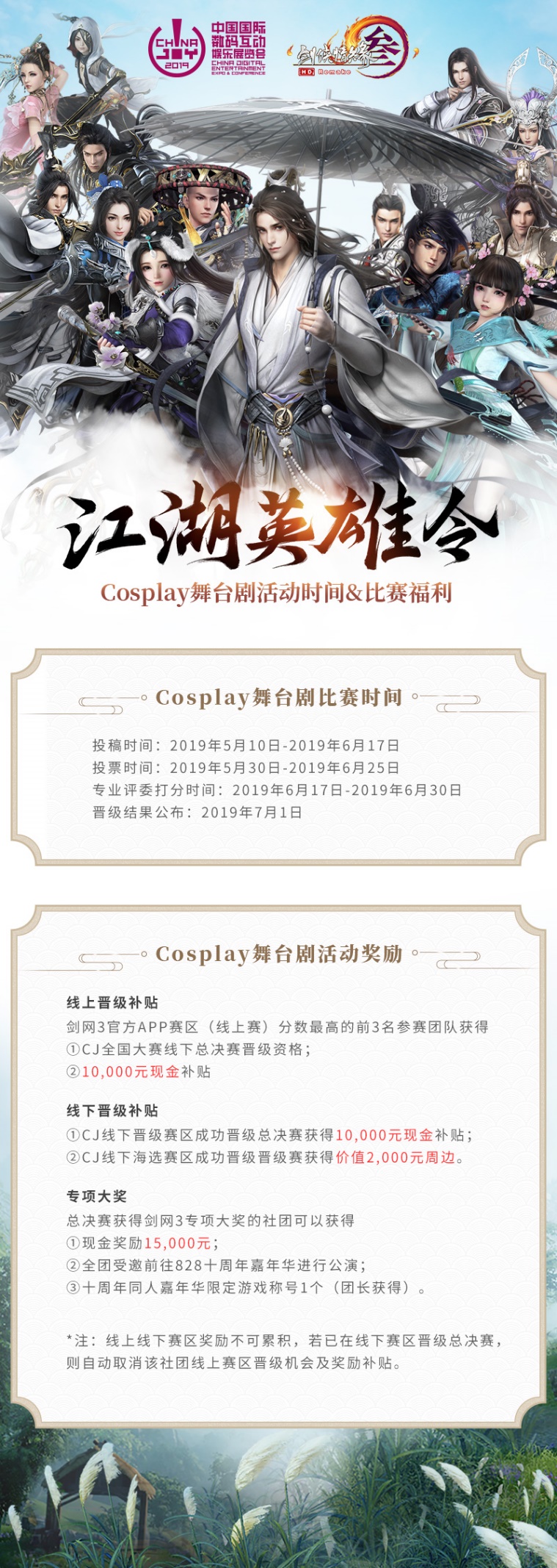 ChinaJoy超级联赛+剑网3再次携手回归2019 ChinaJoy!5月10日-6月17日,凡以“剑网3”为题材的Cosplay剧目,均可上传表演视频参与本次活动。ChinaJoy组委会将掉落3个Cosplay嘉年华总决赛晋级名额作为本次线上活动的奖励。凡是得到晋级名额的社团,可传送至上海参加ChinaJoy超级联赛总决赛并角逐”剑网3”专属奖项以及最高¥15,000元的奖金,还会获得最高¥10,000元的赛事补贴哟!