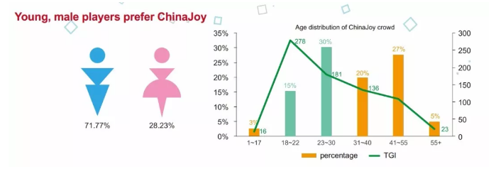 透过线下的流量,可能会更直观一些。一年一度的中国国际数码互动娱乐展览会(ChinaJoy)历经十六载,参与的玩家人数从一开始的上万人一步步增长到了如今的三十多万人。2018年ChinaJoy开幕前,日本游戏媒体4gamer曾引用了一份关于2017 ChinaJoy的数据调查。数据显示当年参与ChinaJoy的玩家超过了34万,其中女性参展者占比约为28.23%——短短四天时间里,约有10万人次的女性用户参与了这场数字娱乐盛会!