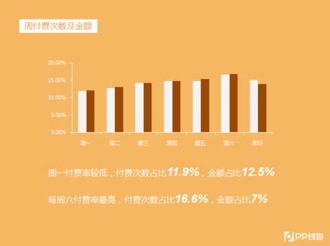 上图是按照周一到周日的付费统计的,会看到周一的付费率略低,虽然整体差别不是很大,在周一,付费次数占比11.9%,金额占比12.5%;周六最高,付费次数占比16.6%,金额占比7%。