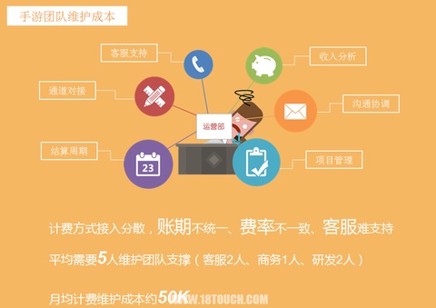 因为每一款游戏方可能要接入的支付方式非常多,而不同的支付方式对于结算周期、结算方式都不一样,所以每一款手游都需要团队维护。比如说需要客服支持,对接结算,功能协调等,这样耗费的时间周期非常长,平均每个团队需要5人左右来持续性的维护整个计费的所有流程。人力、物力成本对于单个手游开发者来说,是比较高的。