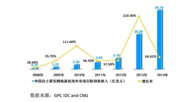 据中国音数协游戏工委《2014年游戏产业报告》和《2014年度中国游戏产业海外市场报告》两份数据分析显示,2014年中国游戏市场实际销售收入达到1144.8亿元人民币,而海外产品贡献额达到418.2亿元人民币,约合67.41亿美元。随着中国自主研发网络游戏海外市场销售额逐年增加,在2014年海外实际销售总额达到30.76亿美元。随着中国游戏产业的健康有序的发展,中国国内外游戏贸易额逐渐成为中国游戏产业链条中最为重要的一环。