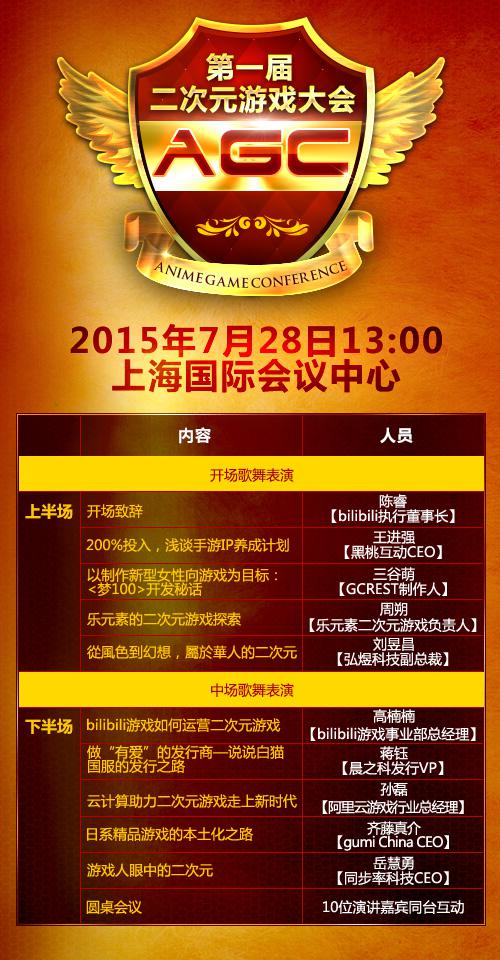 由哔哩哔哩游戏主办的第一届二次元游戏大会(AGC 2015)将于2015年7月28日13:00在上海国际会议中心举办。本届大会着眼中国二次元游戏,汇聚国内外众多精英共同探讨中国二次元游戏的现状以及未来的发展。会议以强大的阵容、独特的视角和新颖的形式,开创行业先河,引发业内人士的广泛关注和高度期待。