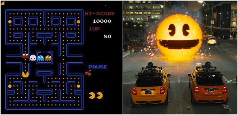 传统“吃豆豆”游戏截图和有2015年“吃豆豆”游戏元素的好莱坞电影Pixels剧照