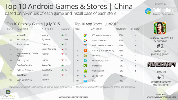 8月31日,Newzoo公布了2015年7月中国安卓应用商店TOP10,360手机助手排名第一,随后是腾讯应用宝以及百度手机助手,前三名同6月份相比没有发生变化,除了比较小幅度的名次变化之外,7月份中国安卓应用商店前十名基本保持稳定。