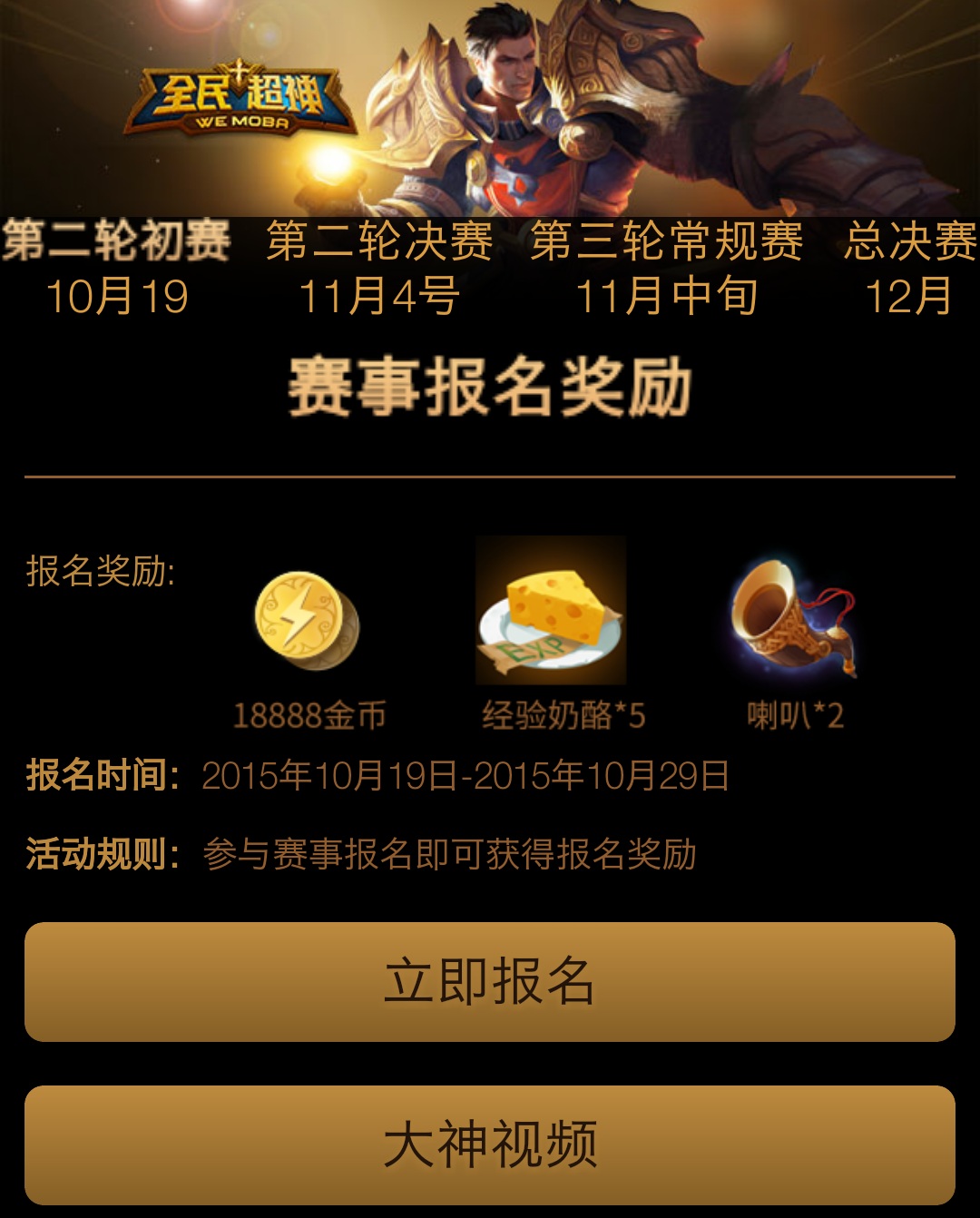 所有报名参赛的用户均可获得报名奖励!本届赛事的六款游戏,只要报名参赛就有豪礼相送,全民报名奖励、全民报名奖励、全民报名奖励!(重要的事情说三遍)以全民超神为例,报名即可领取18888金币,经验奶酪×5和喇叭×2的丰厚奖品。还可邀请好友一同参战,一起感受移动电竞的魅力。