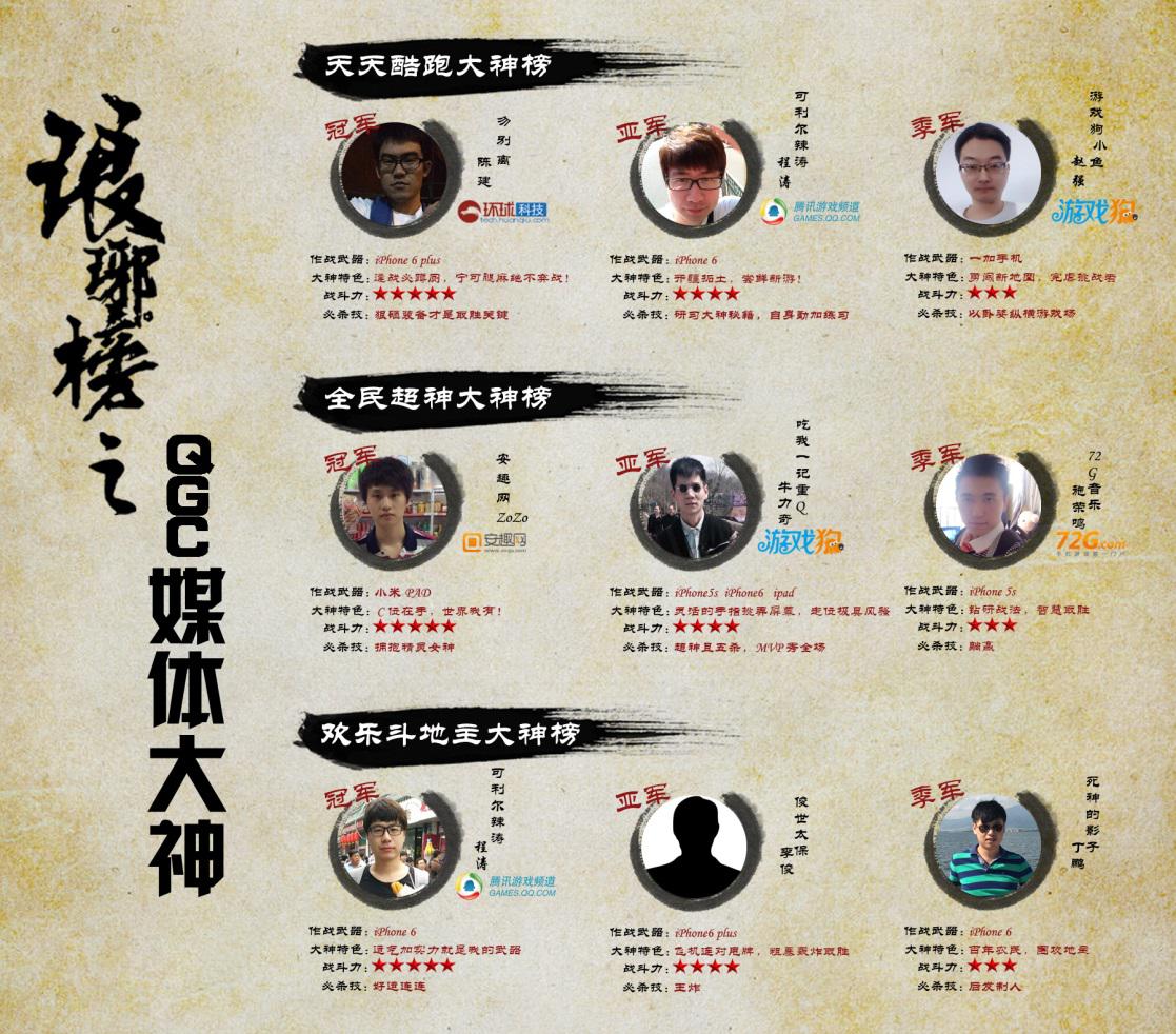 媒体邀请赛最终有8名媒体人分别占据了三款比赛项目的三甲席位,其中来自腾讯游戏频道的程涛为双料大神,独占两个三甲席位。在10月26日落地北京的第二届QGC媒体发布会现场,8名媒体大神出席了颁奖仪式,捧走大神奖杯和奖金。同时,以8名大神玩家为原型的媒体大神“琅琊榜”也趣味出炉。