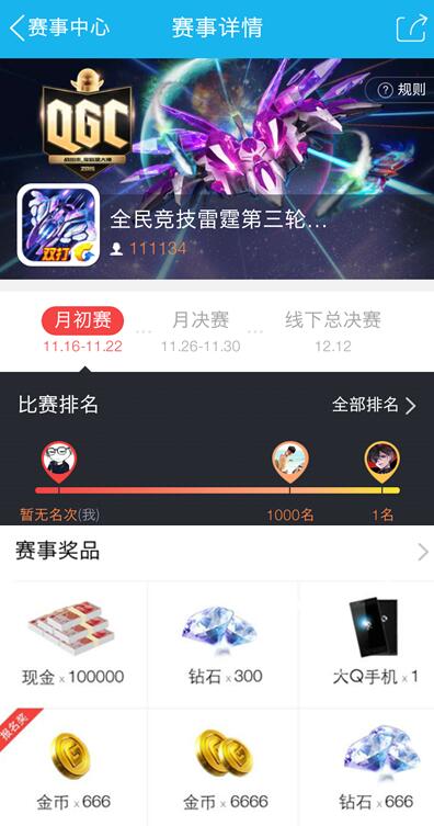 截止到目前,已有近1800万选手报名参加第二届QGC全民竞技大赛,第三轮月度常规赛即将上演激烈KO战,如果你对自己的移动竞技实力抱有信心,就拿起手机参加比赛吧!