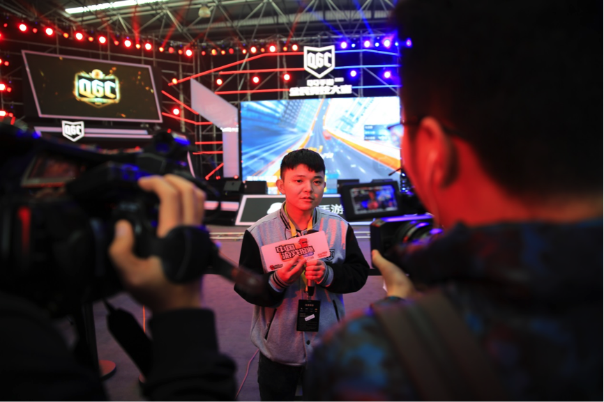 (天天酷跑项目冠军赵根湘接受采访中)