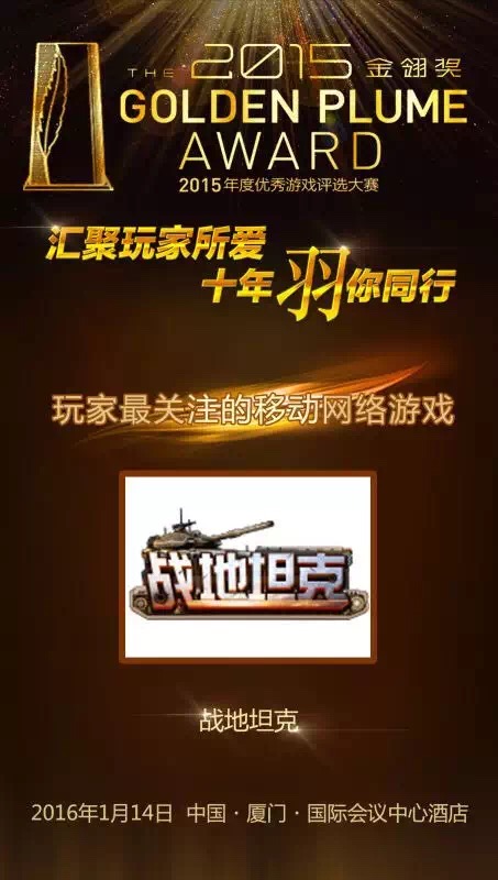 《战地坦克》摘得2015金翎奖“玩家最关注的移动网络游戏”奖项