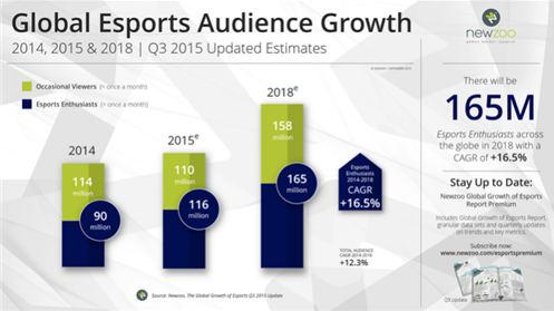 荷兰市场研究公司Newzoo于2015年9月发布的一份题为《电子竞技的全球增长》的数据报告中指出,2015年全球电竞市场收入预计将达到2.71亿美元,同比增长43.1%,而全球电竞爱好者的数量也从2014年的8970万增长至1.16亿。预计至2018年,全球电竞市场收入规模有望达到7.65亿美元,而电竞粉丝的数量有望突破1.65亿。更为值得注意的是,中国电竞市场在2015年的总收入预计将达到3670万美元,中国的电竞爱好者数量也将超过5390万,显而易见的一点是,中国已经成为了世界上最具电竞商机的国家。