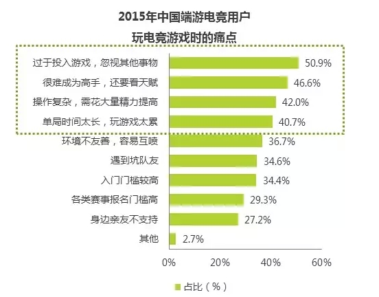 但不可否认的是,除了占总玩家少数的核心玩家以外,整体的传统电竞用户呈逐步轻度化的趋势。艾瑞咨询发布的2015年中国移动电竞行业研究报告清晰指出,“很难成为高手”“操作复杂”已成为让传统电竞用户感到疲惫的主要原因,占调查总数的46.6%和42.0%(多选);“没有足够时间”“玩游戏太累”则成为传统电竞用户流失的主要原因,占调查总数的59.4%和43.1%。