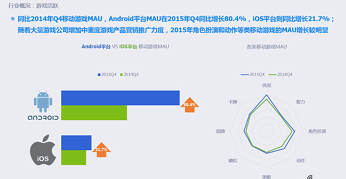 同比2014年Q4移动游戏MAU,Android平台MAU在2015年Q4同比增长80.4%,iOS平台则同比增长21.7%;随着大量游戏公司增加中重度游戏产品营销推广力度,2015年角色扮演和动作等类移动游戏的MAU增长较明显。