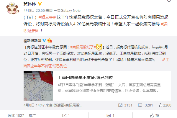 从去年8月21日开始,商标局一个证都没发。对此商标局回应:没纸了。颜文字制作人窦伟伟4月8日公开宣布:将对商标局发起诉讼,将对商标局诉讼纳入4.26亿美元索赔计划。