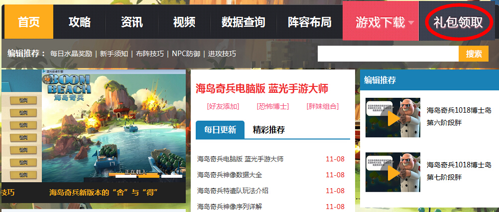 1.点击海岛奇兵专区首页右上方“礼包领取”即可获得游戏礼包。