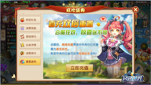 活动内容:合服后,商城充值界面中,所有档位将重置为首充状态。购买所有档位皆可获得双倍钻石奖励!