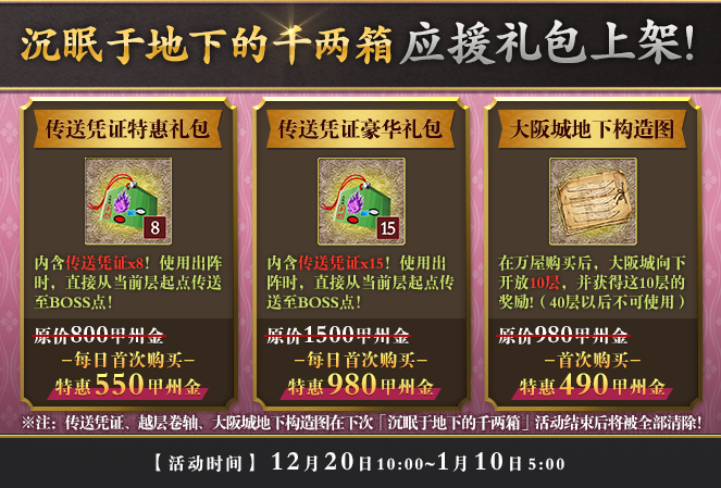 12月20日10:00~1月10日5:00活动期间,应援礼包同步上架万屋。传送凭证特惠礼包内含传送凭证*8,原价800甲州金,每日首次购买特惠550甲州金;传送凭证豪华礼包内含传送凭证*15,原价1500甲州金,每日首次购买特惠980甲州金;大阪城地下构造图原价980甲州金,首次购买特惠价为490甲州金。注:传送凭证、越层卷轴、大阪城地下构造图在下次「沉眠于地下的千两箱」活动结束后将被全部清除。