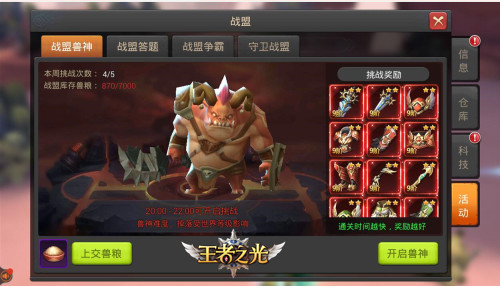 战盟活动是贡献的最主要来源,同时也可以获取其他福利材料。挑战战盟兽神可以获得高级装备;战盟答题活动能获取高额的经验值和战盟贡献,并且前三名可以获得红包;战盟争霸则是全区的狂欢,战盟大混战决出最强王者;另外守卫战盟也有不错的经验加成。