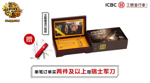 此外,《传奇世界3D》携手中国工商银行打造的正版屠龙刀银镀金吊坠在中国工商银行融e购、京东商城工银金行家旗舰店及中国工商银行线下网点火热发售中!中国工商银行融e购限时限量推出预售优惠活动,预售期间单笔订单买两件及以上赠瑞士军刀一件,赠品限量200件,先到先得!一份荣耀佳品等待您的收藏!