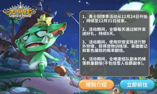双旦来袭,惊喜不断,《光明勇士》在为各位萌主带来海量更新内容的同时,更任性开启双旦盛典狂欢。团购秒杀、鲜花收送、双倍掉落等活动让你购得超值拿到手软。赶紧加入《光明勇士》,将海量珍稀好礼收入囊中,畅享双旦盛典福利吧!