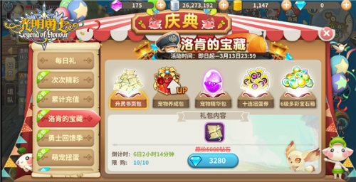 听闻女神节庆典开启,洛肯船长也带来了他收藏多年的宝藏。只要各位萌主大人消耗一定数量的钻石,即可获得升灵书页、宠物养成材料、10连扭蛋券以及6级多彩宝石等丰厚好礼哟~