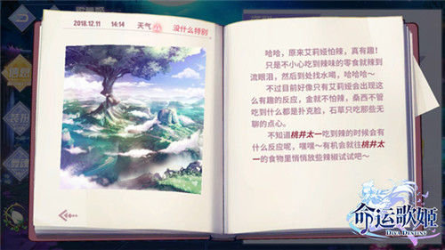 《命运歌姬》中的每个歌舞姬都有自己的日记本,在里面可以发现歌舞姬妾们隐藏事件。比如日常跳舞演出、完成任务、送礼物、升级升阶等等,都可能会被歌舞姬记在小本本上。当可以翻开日记本时,就能发现一些歌舞姬之间的小故事,比如艾莉娅是完全不能吃辣的类型,卡兹卡莉虽然是萝莉的外貌,但是总喜欢问石草各种关于恋爱的问题?不过年龄问题是石草禁止讨论的大禁忌!