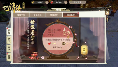 在游戏中,获取千千结碎片的途径不仅仅只有情缘商城购买。还可以通过购买情缘基金方式获取哟!购买情缘基金不仅可以获得千千结碎片,还能获得大量赤玉奖励。