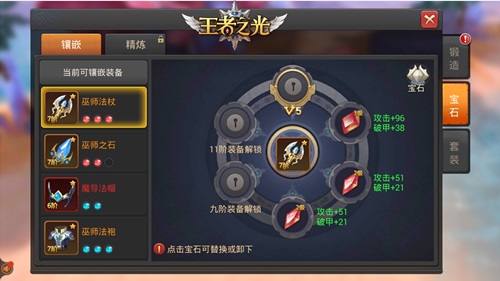 了解了装备基本属性之后,我们可以打开装备锻造界面,对装备进行更高等级的打造。首先我们可以对装备进行强化,消耗金币即可。但要注意一点,装备强化到后期消耗较大,大家可以根据自己的金币储存量量力而行。另外,每件装备可以镶嵌宝石,宝石也可进行升级,继续增加人物战力和属性。