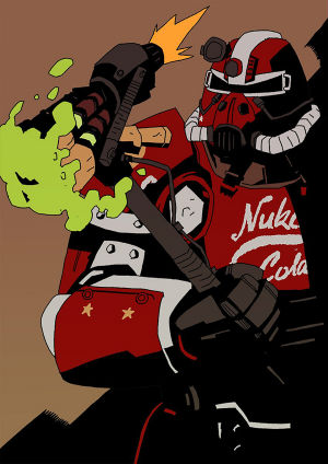 废土中什么样的服装最让人有安全感?答案肯定是一套量身定制的动力装甲。但您知道有什么比动力甲更好么?那当然是个性定制的动力甲了!就比如这身核子可乐涂装的T-51动力装甲,不仅仅拥有鲜艳的外表,头盔里更是内置了冰爽可乐饮用装置,让您不用脱下头盔就能畅饮冰镇的核子可乐,还有什么比这更快乐的呢?