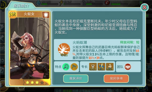 火蚁女是继壮壮之后第二个SSR护卫职业的英雄,拥有强大的防御能力以及反伤能力。专有特长“火毒刀”在对敌人造成增强伤害的同时化解敌人攻势,让火蚁女有更充足的余裕同敌人周旋。火蚁女的生命值上限参与“火蚂蚁潮”伤害的计算,因此 “坚韧”提供的生命值不仅让火蚁女有了承受伤害的资本,更加强了她的报复能力。这种机制可谓完全改变了前排英雄防御力不足纯靠血量支撑的现状,明确了火蚁女“输出型护卫”的定位。