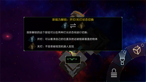 当玩家操控小主角Tony在必经之路行进碰到视觉机器人时,玩家可以通过操作“开灯/关灯状态切换”按钮进行躲避。该按钮同样也可以在两种状态间进行切换。开灯时,玩家可以看清楚自己的位置及附近被烟雾覆盖的物体;关灯时,玩家可以隐身,不容易被视觉机器人发现。玩家可以在开灯状态下观察周围地图环境,以便在关灯状态下能够顺利利用周边环境,避免与视觉机器人的正面冲突。