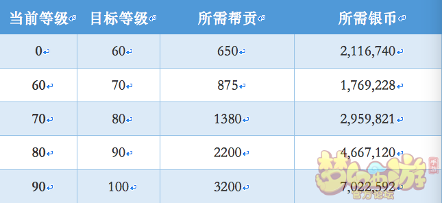 与其它技能一样,最高只能学到人物等级+10级的等级。下面分段把升级所需要的帮贡、银币为大家罗列出来,以便于大家做一个参考囤一些银币和帮贡。