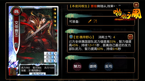 讨论如何布阵如何释放技能,先要看看这名武将在团队中的定位。从本身的被动技能来看,雄狮、反弓两个技能,可以让曹丕成为前排肉的存在,在传统的魏五骑或者魏四骑一弓的阵容中,是可代替武帝曹操担当前排肉盾的存在,所以给他的战器被动以护甲、破甲、持盾最优。只不过和他老爹曹操不同的是,武帝曹操是弱化对面,而文帝则是提升自身团队输出。