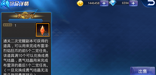 通关二次觉醒副本可以获得的道具,可以用来完成布雷泽·烈焰狂爪的前五个二觉任务。该道具满10个可以兑换成勇气结晶,勇气结晶用来完成布雷泽的最后1个二觉任务。游戏内玩家一旦兑换成勇气结晶便无法兑换回勇气碎片,在游戏中玩家做二觉任务的时候需要多注意一下,否则兑换多了也是浪费资源,导致前面的觉醒任务材料缺少等情况。