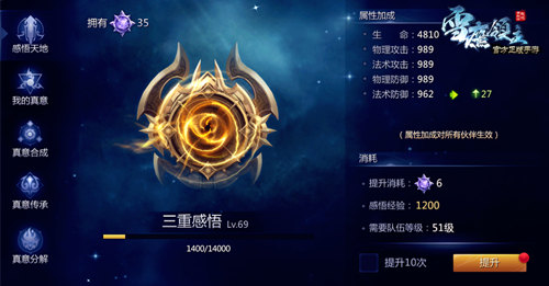 真意系统开启之后,《雪鹰领主》手游玩家可通过感悟天地,也就是消耗领悟点,来提升生命值、物理攻击、法术攻击、物理防御、法术防御等方面的属性加成,且此加成属性对所有伙伴都生效。领悟点可通过天穹牢狱、云雾杀阵等方式获取。