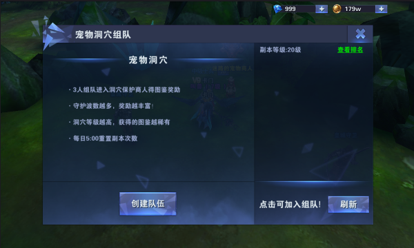 当我们升到20级后就可以组队参加宠物洞穴副本了,每人每天只有一次进入副本的机会,如果您有足够的钻石,就可以再购买一次进入机会。