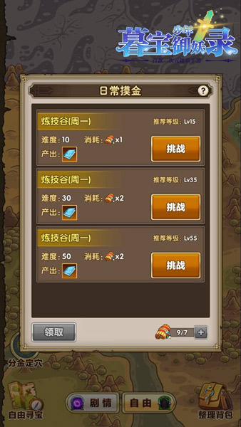 日常摸金是日替任务,是玩家每日必然要探寻的迷宫副本。玩家可从主界面或自由寻宝界面,使用寻龙诀进入副本获取资源。根据日期不同,掉落的珍贵资源也有所不同。因此,玩家要有所把握,重点刷当前所缺所需的资源。